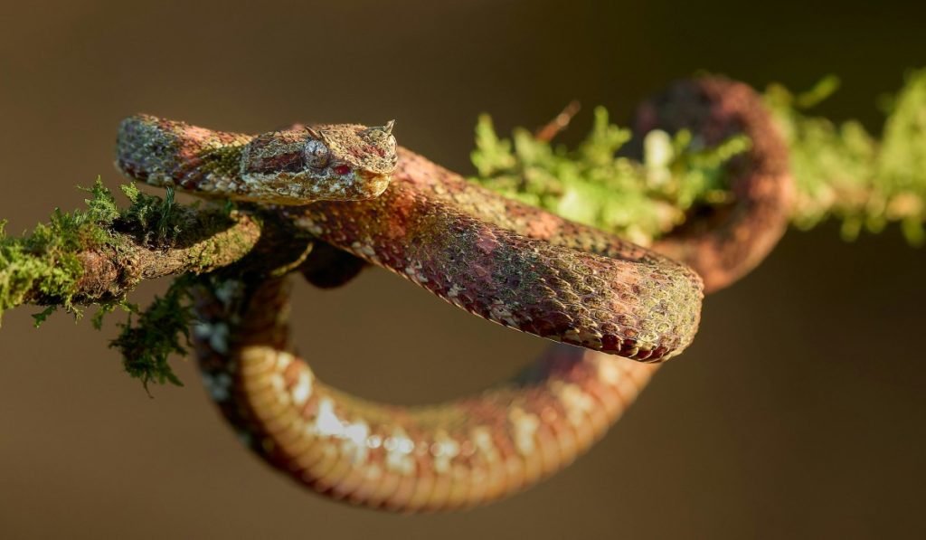 Die Wimpernviper ist eine atemberaubend schöne Schlange, die ihren Namen von den Schuppen über den Augen hat, die langen Wimpern ähneln. Diese giftige Schlange, die in den Tieflandregenwäldern Costa Ricas vorkommt, ist für ihre leuchtenden Farben bekannt, darunter helles Grün, Gelb und Rot. Auch wenn sie harmlos aussieht, kann das Gift der Wimpernotter bei einem Biss schwere Verletzungen verursachen.